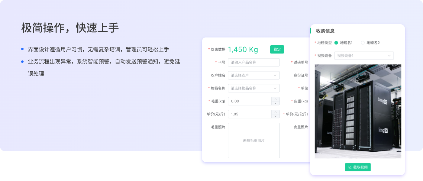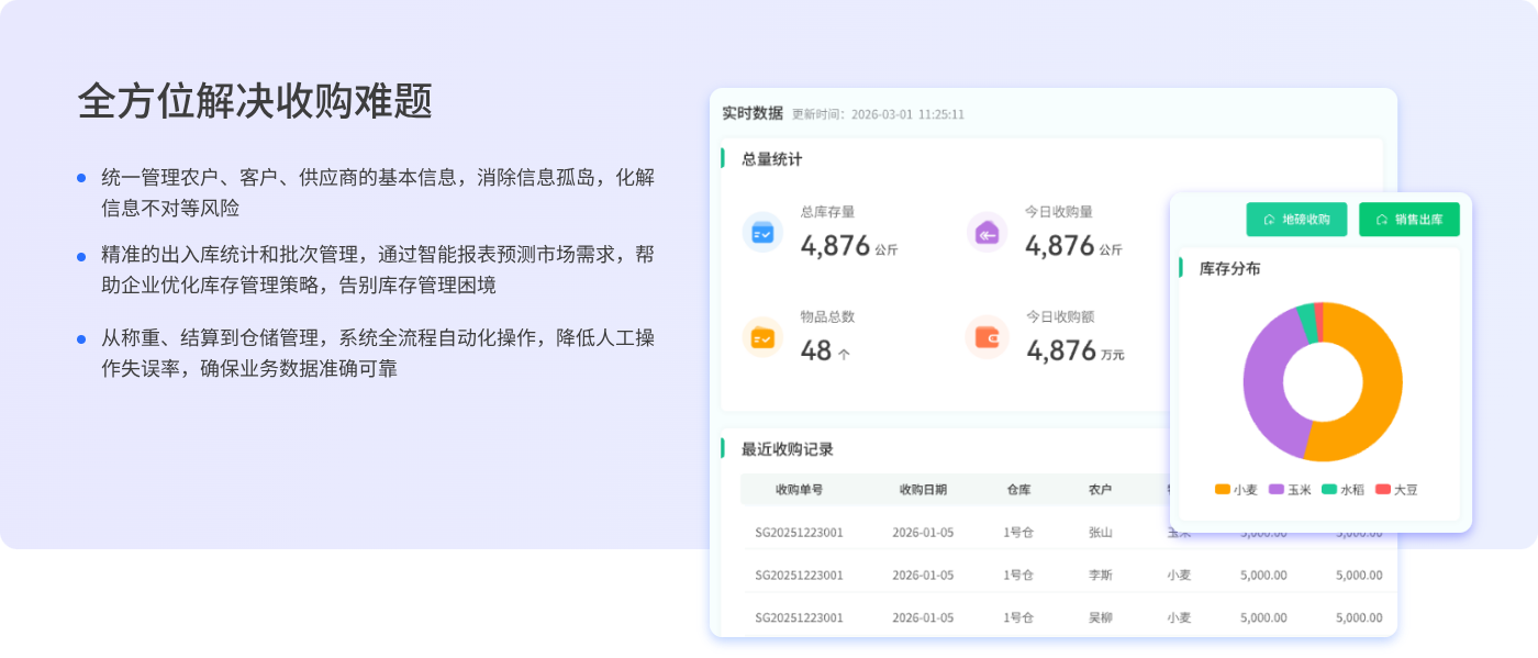 智慧收购,精准高效自动对接地磅系统,实时获取称重数据。每一笔交易数据均被完整记录,确保交易信息可回溯、可审计。