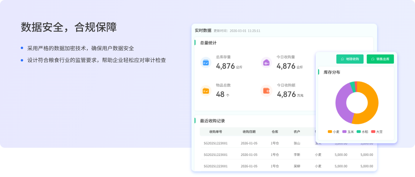 收粮帮是专门针对粮食收购业务开发的智能化管理平台,通过数字化手段全面革新传统的收购模式,旨在提升粮食收购全流程的透明度、安全性和运营效率。系统集成收购管理、销售管理、库存监控、财务结算、智能报表等核心模块,实现从粮源到仓储的全链路精准管理,助力企业实现粮食收购的数字化升级。